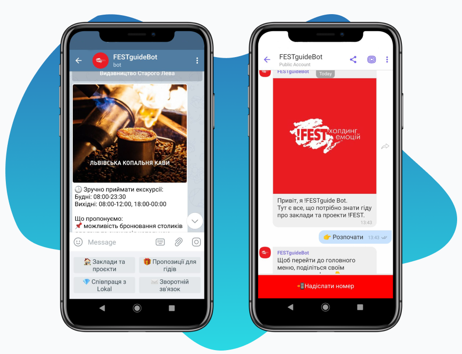 On this project, our goal was to create a Telegram and Viber chatbot for the Ukrainian chain of restaurants and establishments !Fest. The key users of these chatbots are the guides who conduct tours in !Fest’s partner cities. Chatbots provide information on the terms of cooperation between !Fest and guides, establishments, restaurants, and special offers.